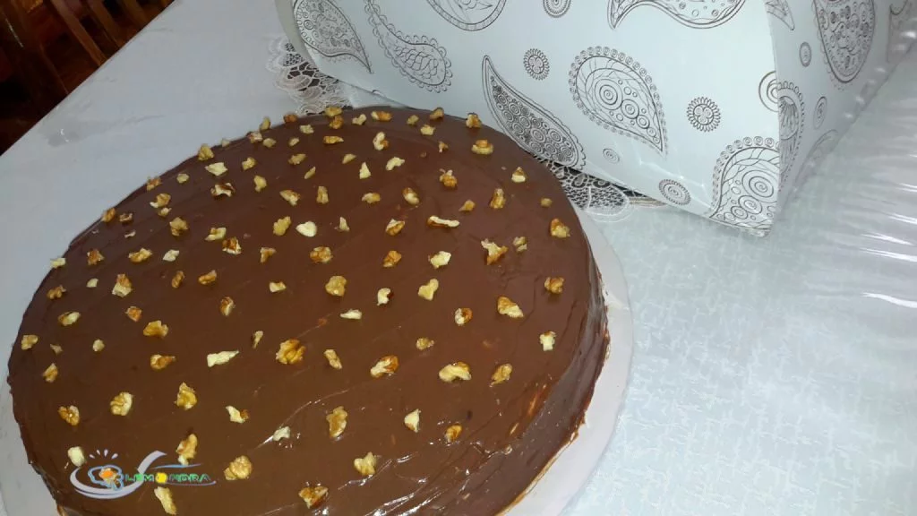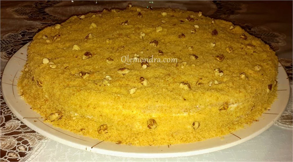 13 Hazırdır | Tortu Bəzəmək ÜçünXəmir soyuduqdan sonra isə tort bəzədilir. Xəmirlərin kənarının səliqəsiz hissələri bıçaqla kəsilib səliqəyə salınır, hər biri isladılır, arası kremlənir, qoz əlavə edilir. |