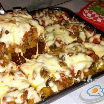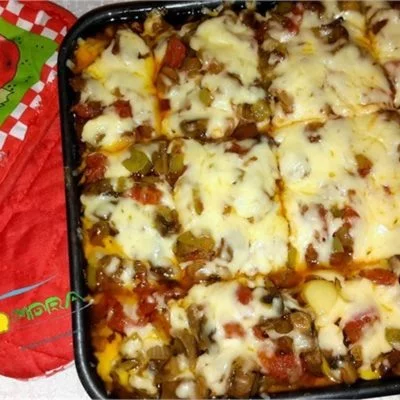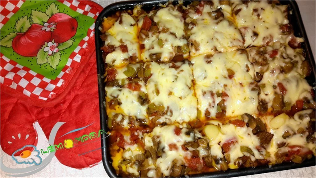 8 Hazırdır 200° C, 7-8 dəqiqə | Ən sonda isə holland pendiri sürtgəcin iri gözündən keçirilib hər tərəfinə səpilir və 200 dərəcə sobada pendir əriyənədək (7-8 dəqiqə) bişirilir. |